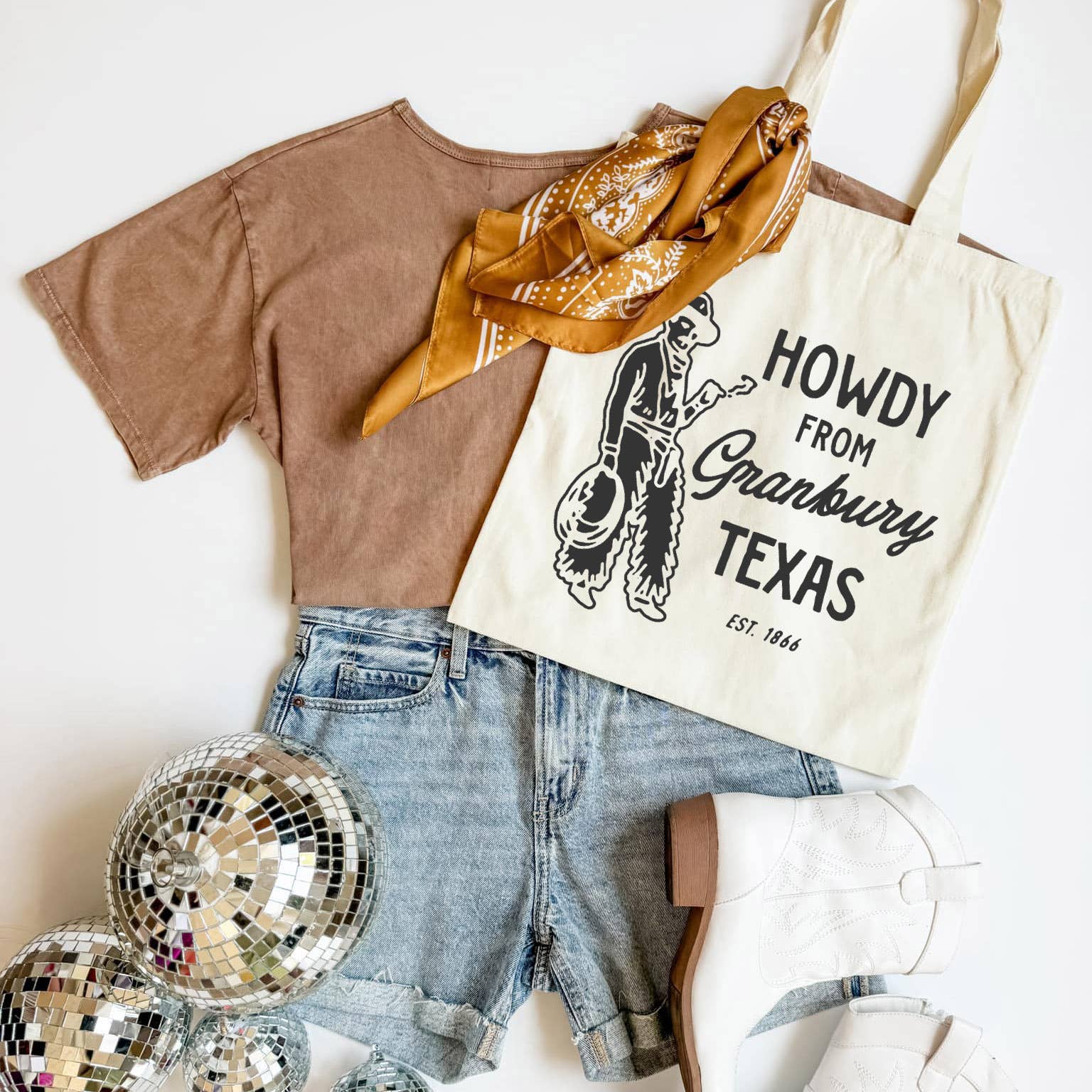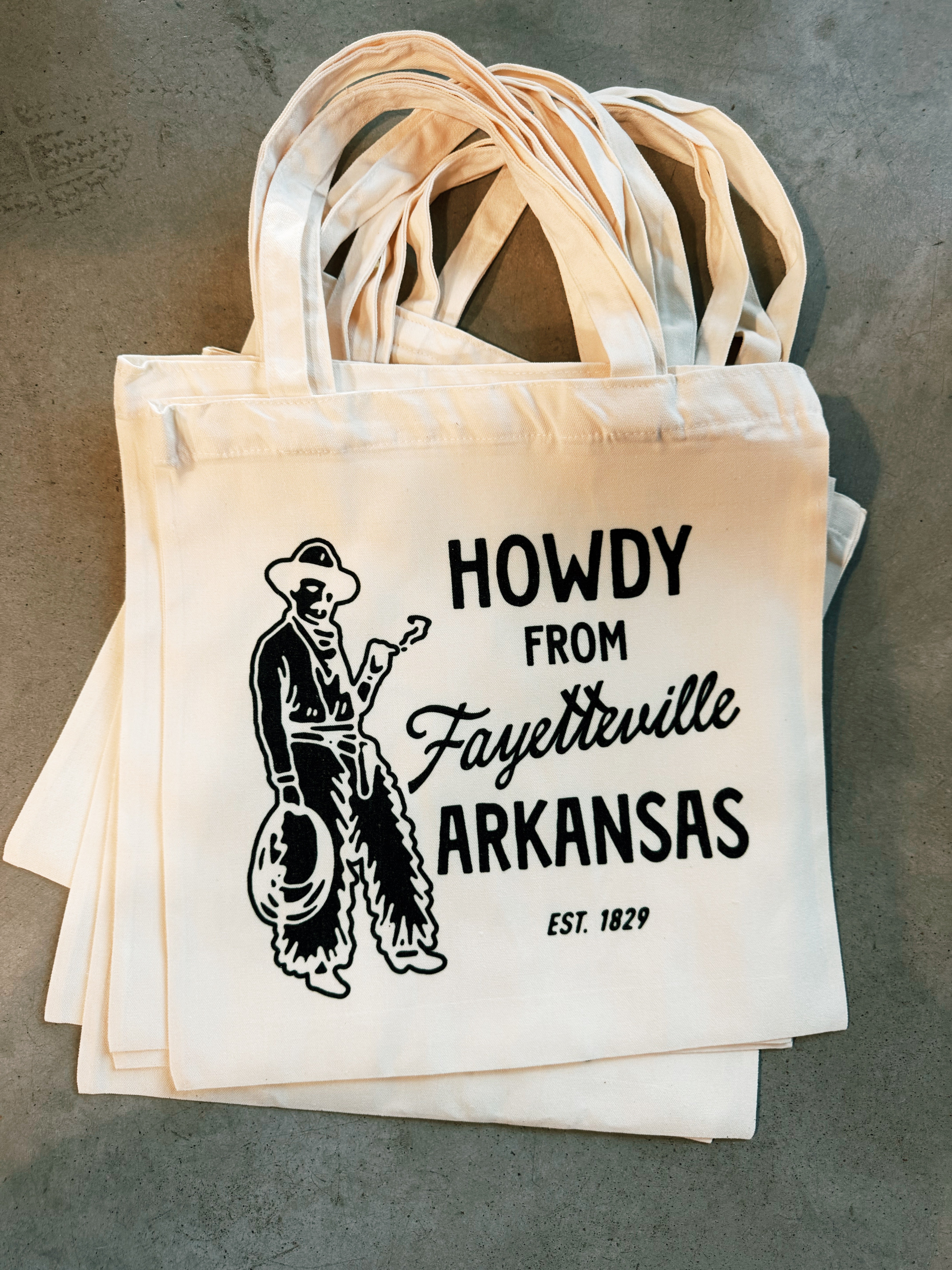 Give everyone a warm Western welcome with our “Howdy From Fayetteville AR” tote bag, featuring a vintage style cowboy riding tall in the saddle. With bold retro charm and customizable location text, this cotton canvas tote is perfect for anyone looking for fun, nostalgic merch that celebrates local pride.