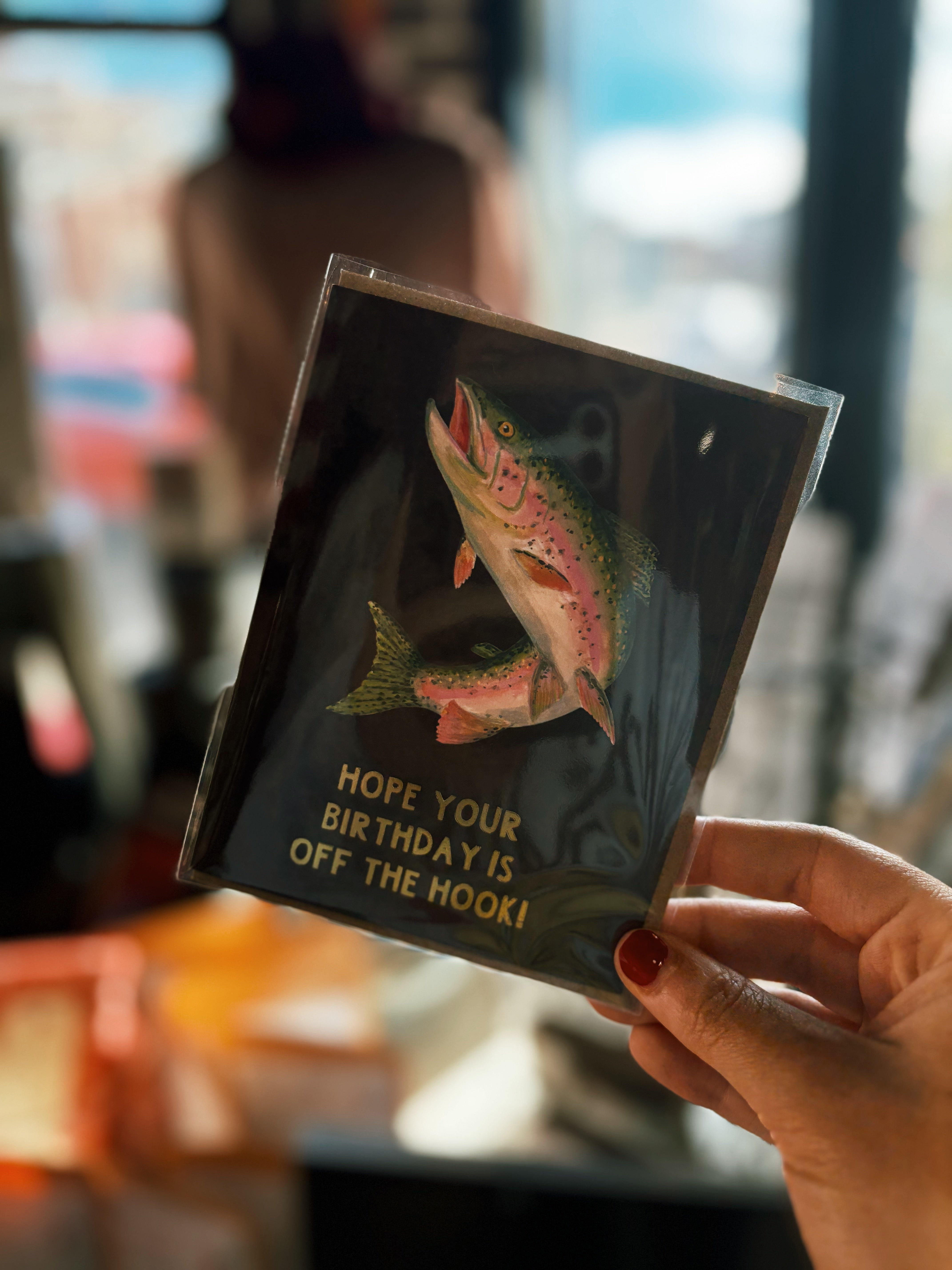 Send a reel-y fun birthday wish with the Off the Hook Fishing Birthday Greeting Card! Featuring a vibrant hand-painted trout and playful pun, this card is perfect for anyone who loves casting lines and catching laughs. Ideal for outdoorsy friends, anglers, or anyone who appreciates a good fish joke on their big day. Format | A2, 4.25×5.5" Interior | Blank Foil | Gold Envelope | Envelope color may be either kraft or beach. Sentiment | Hope your birthday is off the hook!