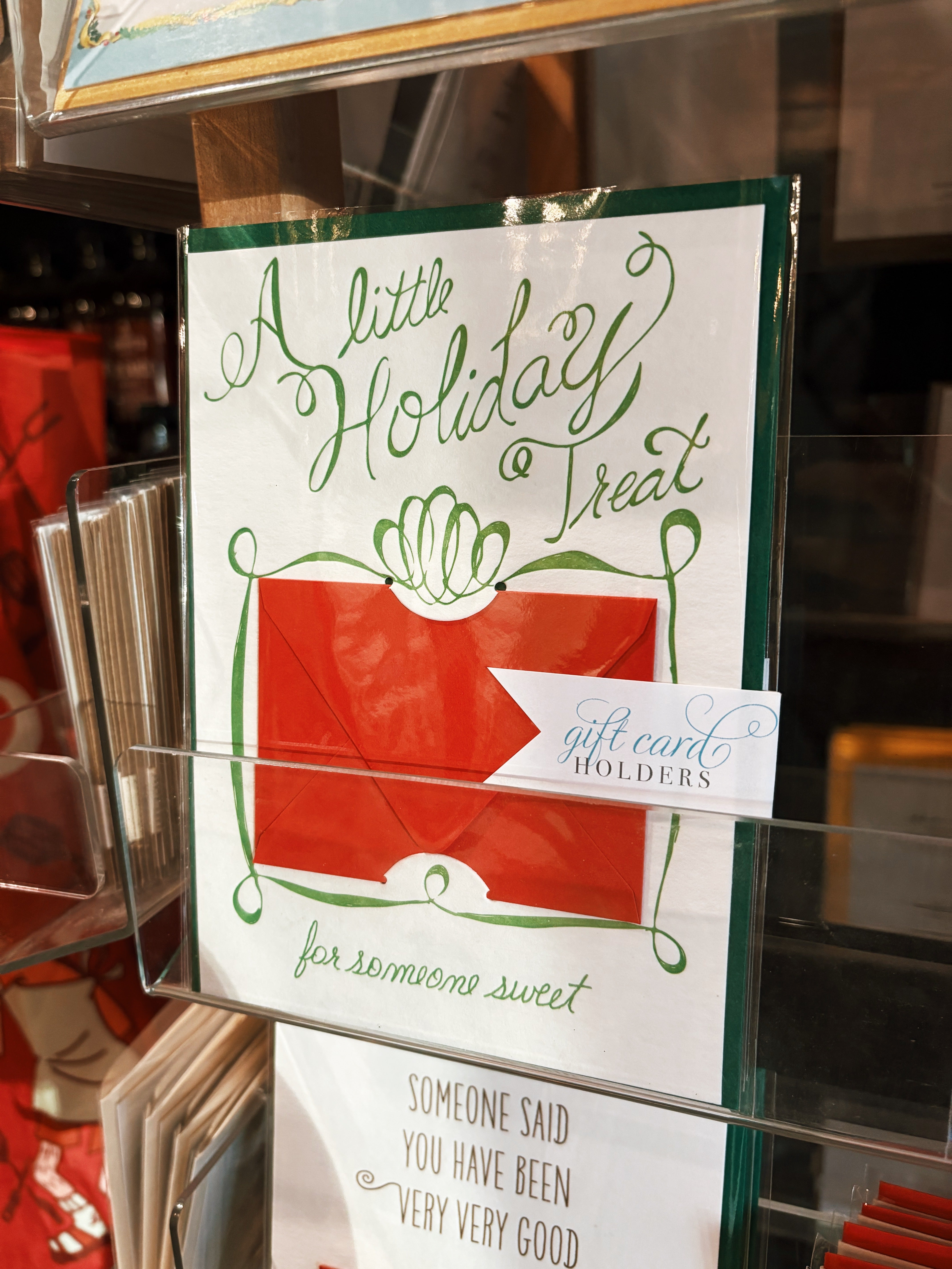 Gift cards are the easiest gift to give and are always well received. Our Gift Card Holders are the perfect way to dress them up! Place your gift card, check, or cash in the tiny envelope, which nestles into the slots on our letterpress card. Remove the tiny envelope to reveal a bonus message underneath! “A Little Holiday Treat For Someone Sweet!” bonus message - “enjoy!"