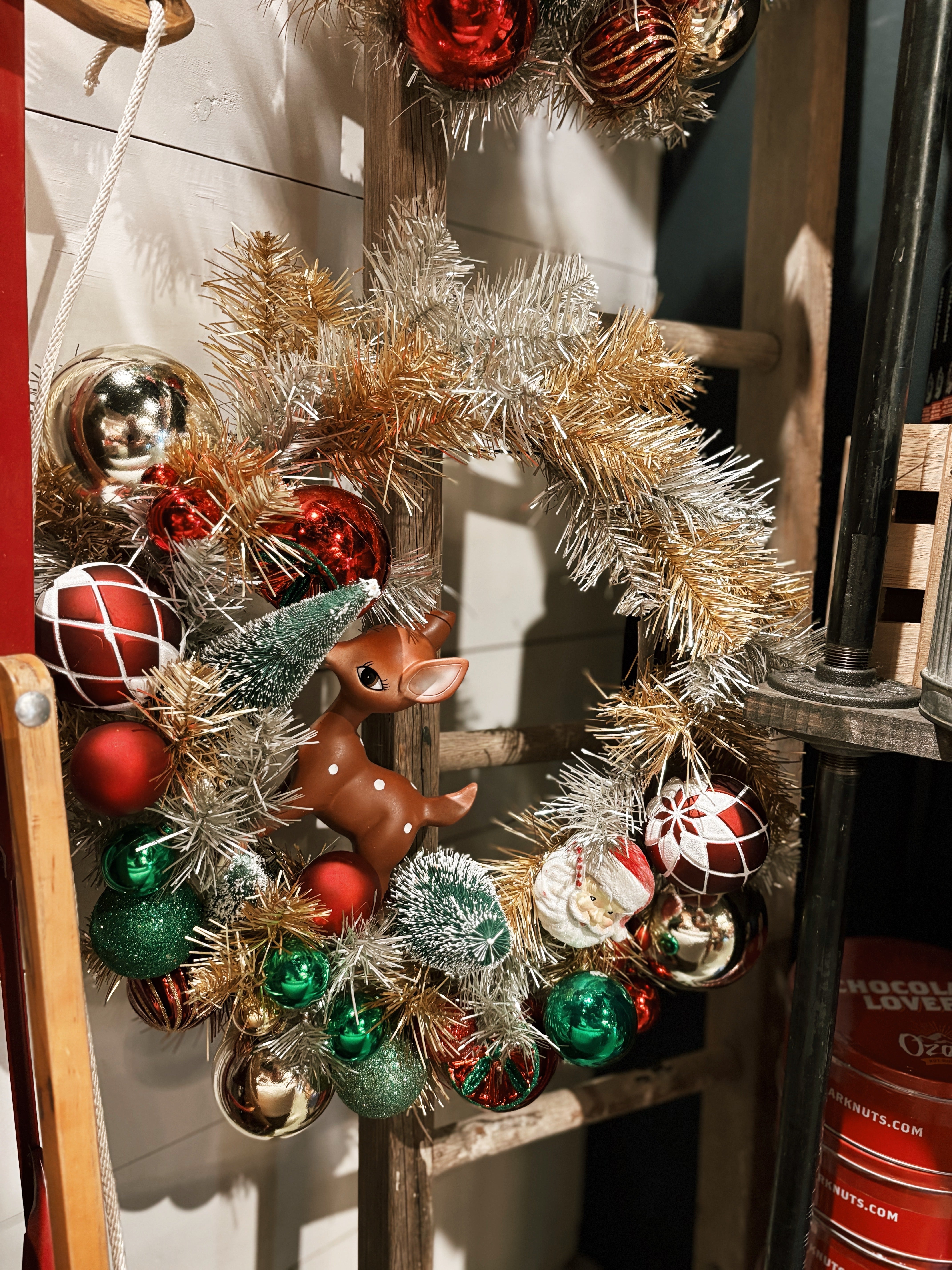 The 1950s holiday style has been reimagined in a whimsical way, gathered together in a shiny, festive wreath. A vintage mix of all the most iconic symbols of Christmas, from Santa to reindeer and trees, silver and gold tinsel, and red and green balls, our Retro Tinsel Wreath is packed with all the nostalgic archetypes of the season.