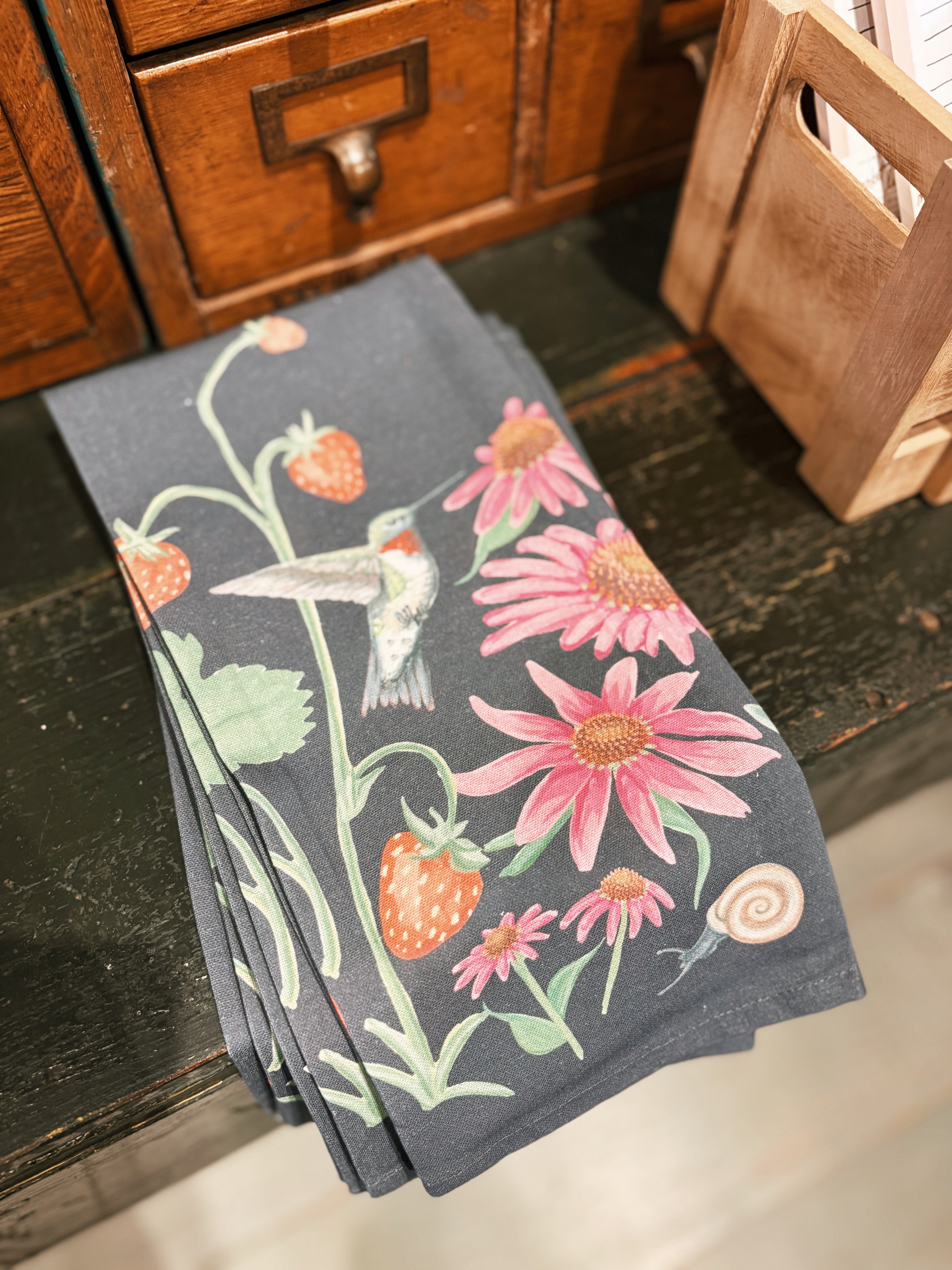 Add a touch of nature to your kitchen with our Garden Blooms Kitchen Towel. Featuring a charming design of wild strawberries, delicate snails, vibrant poppies, and hummingbirds, this towel brings the beauty of wildflowers right into your home. The inclusion of purple coneflowers adds a splash of color, making it the perfect piece for nature lovers and gardening enthusiasts.