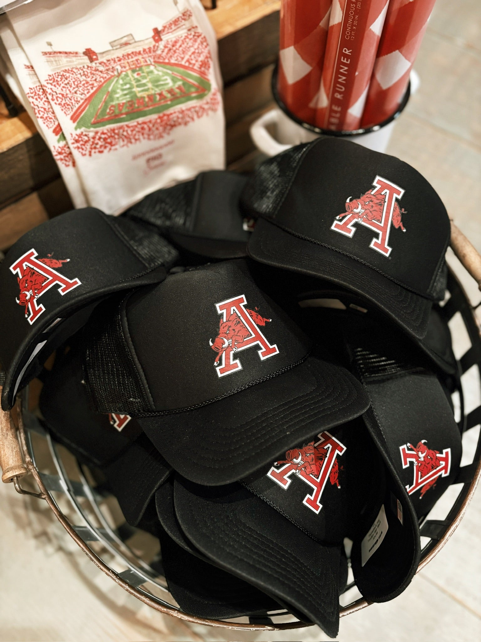 Bring the retro Razorback vibes with our Throwback Hog Trucker Hat! This Otto black unisex cap is crafted by a local Arkansas maker and features a vintage-style hog patch that’s perfect for game days, tailgates, or just reppin’ your state in style.
