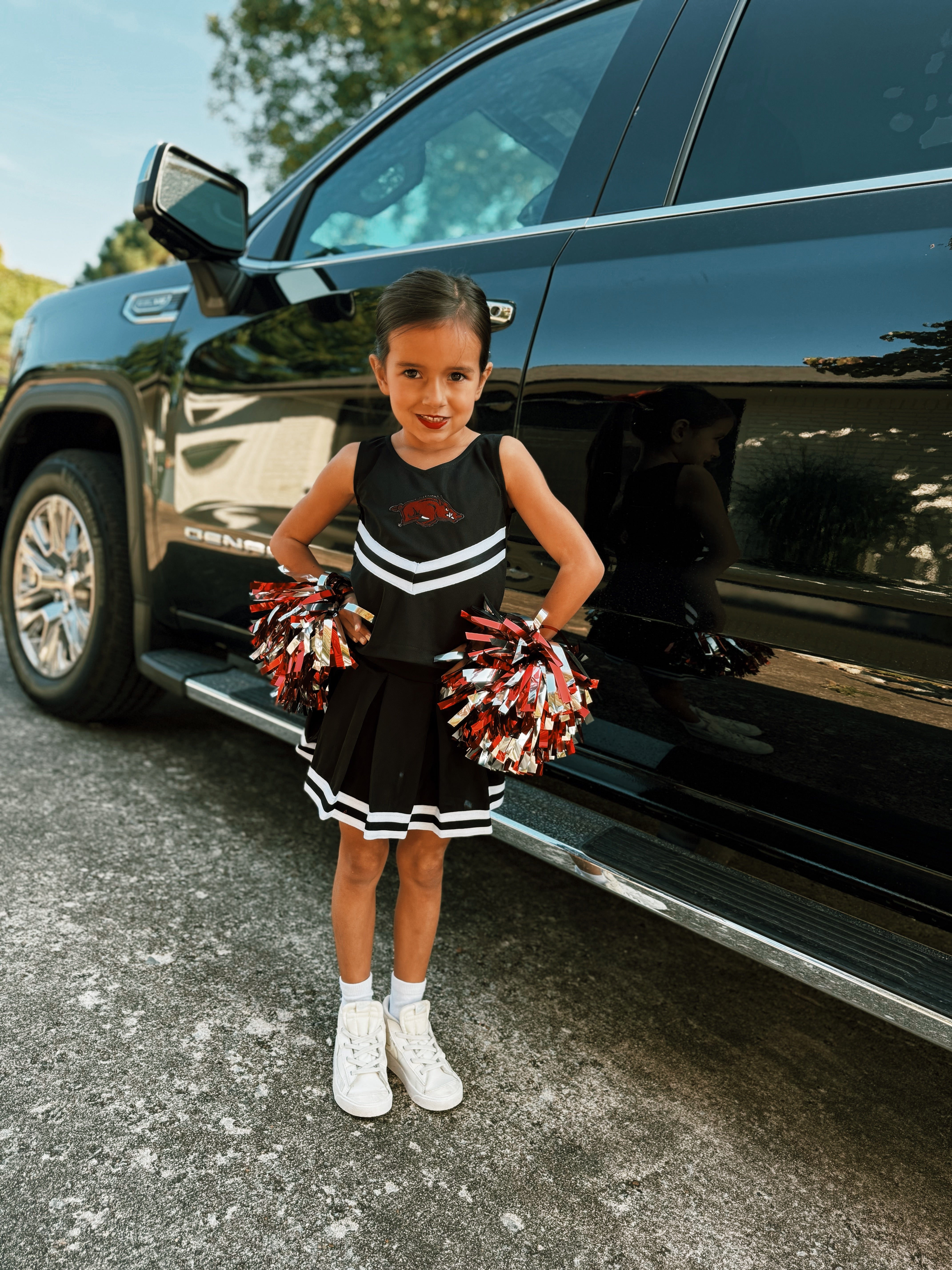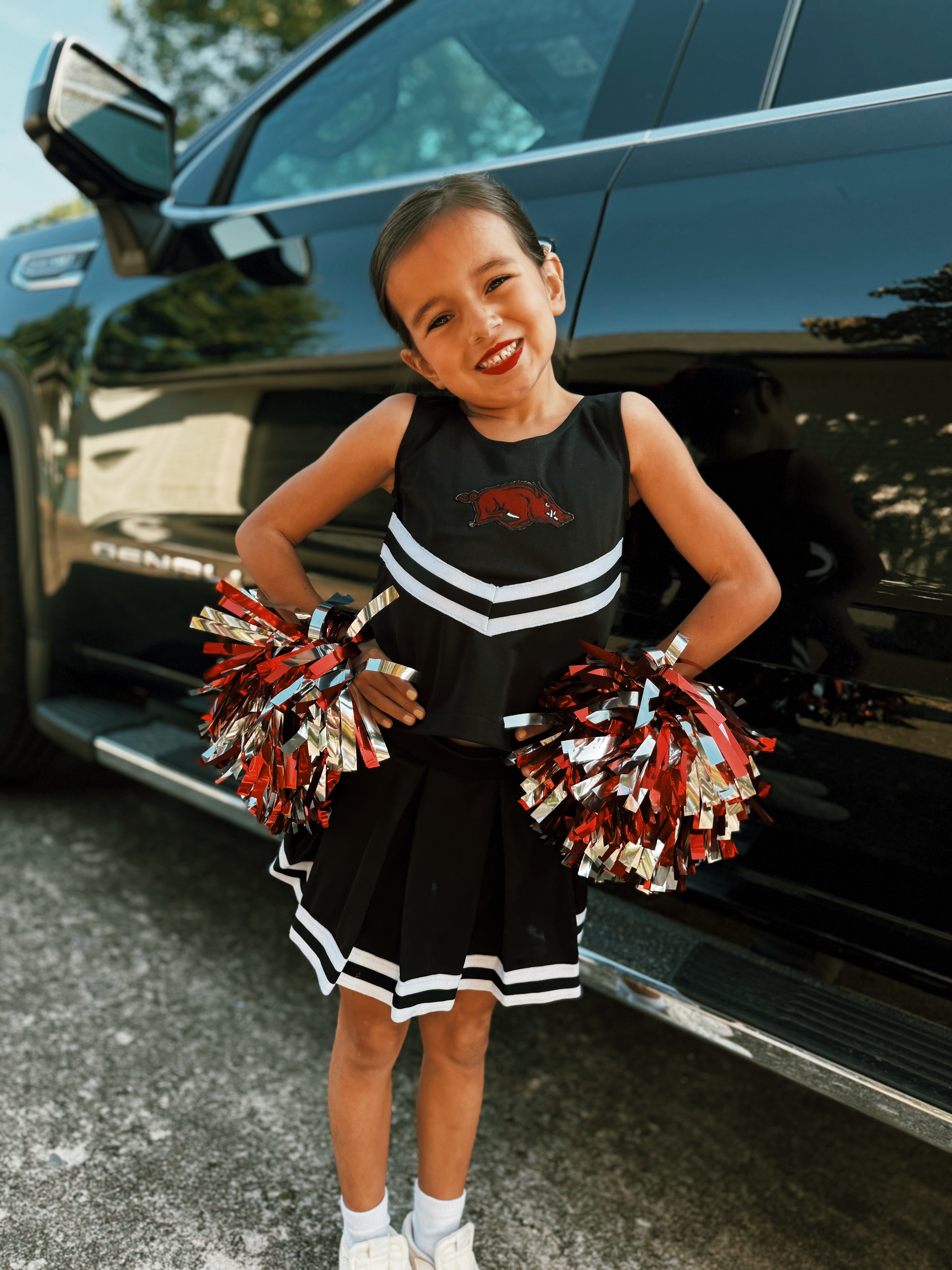 Your little fan will be game-day ready in this adorable 3-piece cheer set! Featuring a top, pleated skirt with side zipper, and matching bloomers—all in 100% polyester with embroidered Razorbacks pride. Officially licensed and perfect for showing team spirit in style!