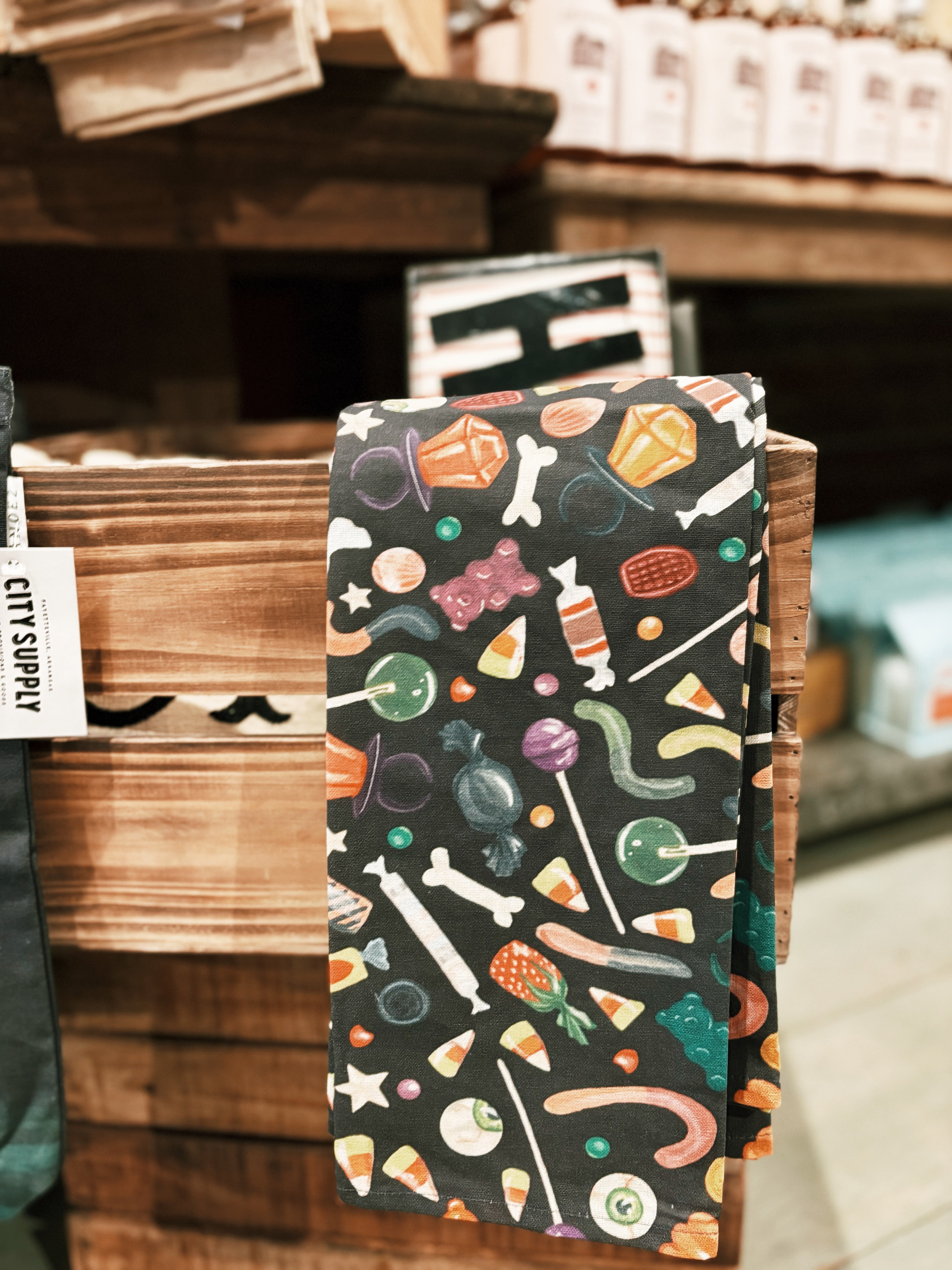 Add a festive touch to your kitchen with the Spooky Sweets Halloween Tea Towel! Featuring a hand-illustrated pattern of classic Halloween treats—candy corn, lollipops, gummy bears, and more—this playful design is perfect for trick-or-treat season. Use it to dry dishes, line a treat tray, or add a spooky-chic vibe to your decor. A must-have for Halloween lovers and candy enthusiasts alike! Features